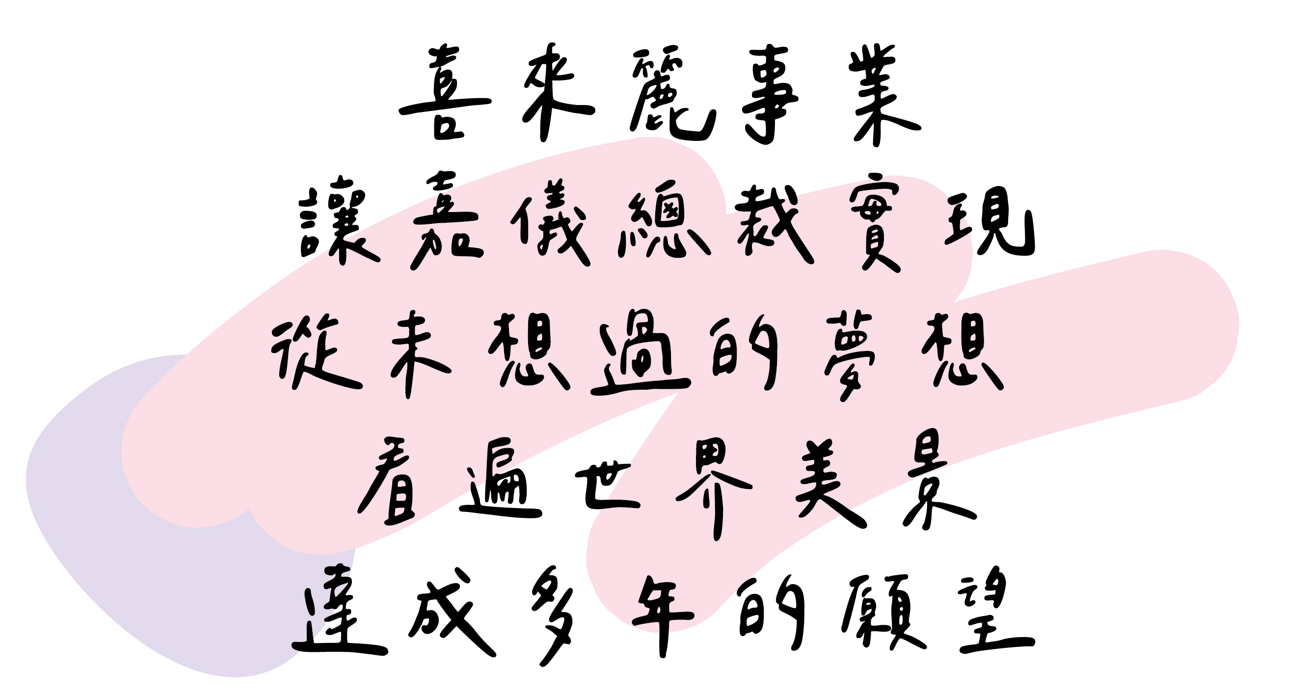 改變辛苦一陣子,不改變辛苦一輩子,所以嘉儀總裁選擇喜來麗,一輩子的努力可以累積創造,我們都值得擁有更好的自己,歡迎一起在喜來麗發光發熱,完成夢想。